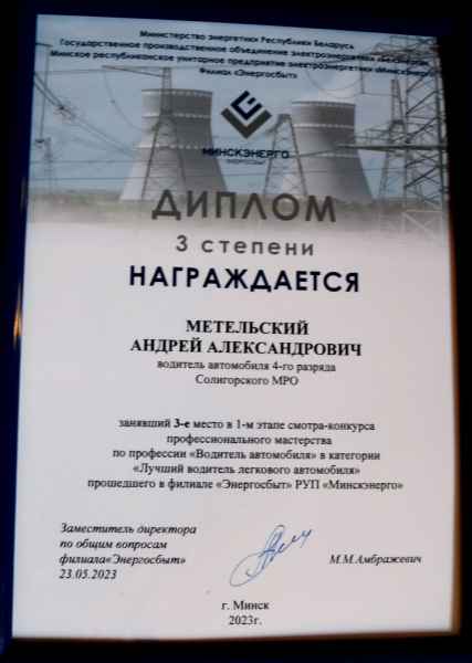 3-е место в первом этапе смотра-конкурса профессионального мастерства по профессии «Водитель автомобиля» в РУП «Минскэнерго» в категории «Лучший водитель легкового автомобиля» Метельский Андрей Александрович – водитель автомобиля 4-го разряда службы механизации и автотранспорта (Солигорского МРО).