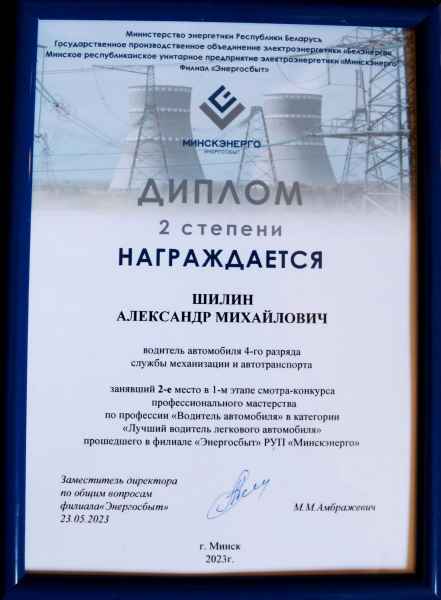 2-е место в первом этапе смотра-конкурса профессионального мастерства по профессии «Водитель автомобиля» в РУП «Минскэнерго» в категории «Лучший водитель легкового автомобиля» Шилин Александр Михайлович – водитель автомобиля 4-го разряда службы механизации и автотранспорта.