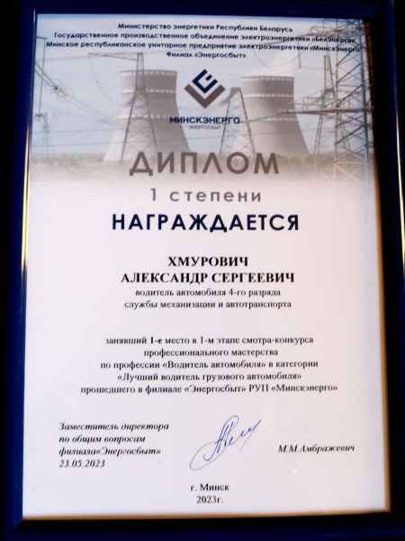 1-е место в первом этапе смотра-конкурса профессионального мастерства по профессии «Водитель автомобиля» в РУП «Минскэнерго» в категории «Лучший водитель грузового автомобиля» Хмурович Александр Сергеевич – водитель автомобиля 4-го разряда службы механизации и автотранспорта.
