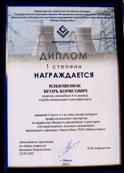 1-е место в первом этапе смотра-конкурса профессионального мастерства по профессии «Водитель автомобиля» в РУП «Минскэнерго» в категории «Лучший водитель легкового автомобиля» Ильюшонок Игорь Борисович – водитель автомобиля 4-го разряда службы механизации и автотранспорта.