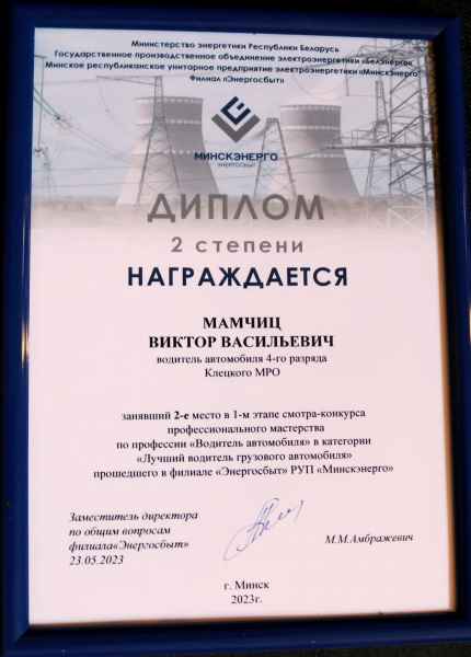 2-е место в первом этапе смотра-конкурса профессионального мастерства по профессии «Водитель автомобиля» в РУП «Минскэнерго» в категории «Лучший водитель грузового автомобиля» Мамчиц Виктор Васильевич – водитель автомобиля 4-го разряда службы механизации и автотранспорта (Клецкого МРО).