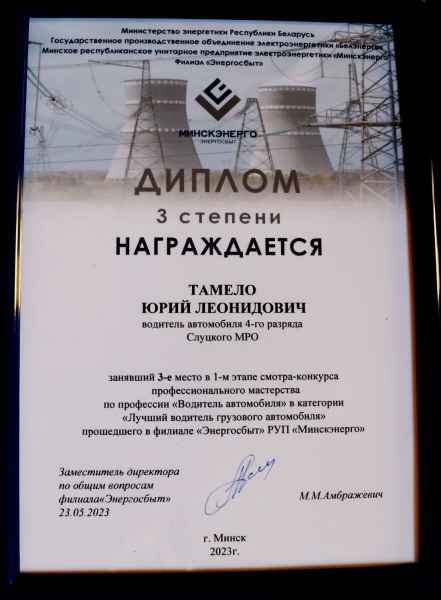 3-е место в первом этапе смотра-конкурса профессионального мастерства по профессии «Водитель автомобиля» в РУП «Минскэнерго» в категории «Лучший водитель грузового автомобиля» Тамело Юрий Леонидович – водитель автомобиля 4-го разряда службы механизации и автотранспорта (Слуцкого МРО).